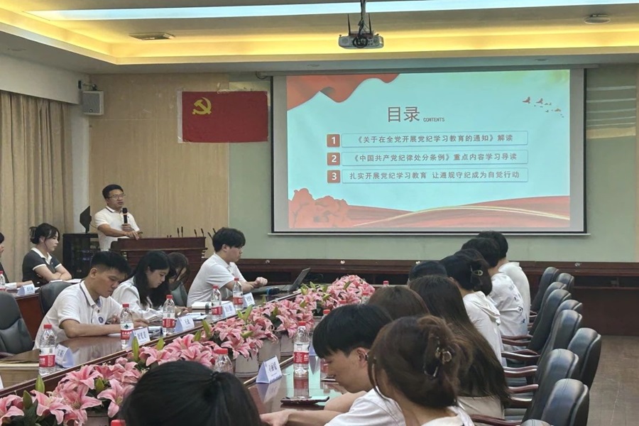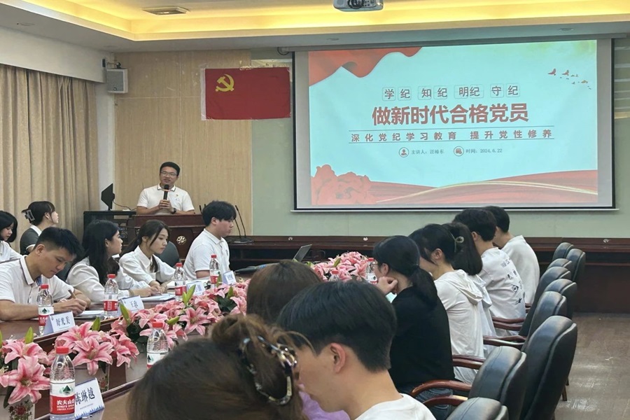 为做好 2024 届毕业生党员教育管理服务工作,加强员工党员党性锻炼,深入学习党的自我革命思想,教育引导毕业生党员牢记党员义务。公司党总支于6月22日在第二行政楼208开展2024届毕业生党纪学习教育专题党课,由公司党总支书记汪椿东主讲。参加本次党课学习的有公司党总支组织员杨丹铭、员工第二党支部书记袁小蕾、员工第三党支部书记王政和全体毕业生党员。