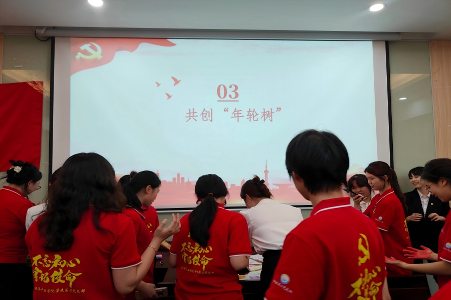 本次党日活动首先组织全体党员集中观看了建党主题视频《一百年来,我们从未忘记因何而出发》。该视频生动展示了我们党自成立以来紧密团结并引领人民取得的辉煌成就,激励大家从光辉历程中汲取前进力量,观看过程中党员们全神贯注,进一步坚定了理想信念。随后进入交流环节,陈佳玲等六位预备党员及各党小组代表依次结合自身实际分享学习感悟,表达了向党组织靠拢的决心。活动亮点“手印年轮树”共创随即展开,党员们蘸取颜料,将手掌印在象征支部成长的“年轮树”上,一个个手印汇聚成枝繁叶茂的“信仰之树”,既展现了支部凝聚力,也寓意着全体党员在党的引领下接续奋斗、茁壮成长。