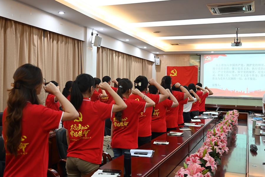 随后,袁佳宁带领全体党员同志在党旗面前宣读入党誓词。
