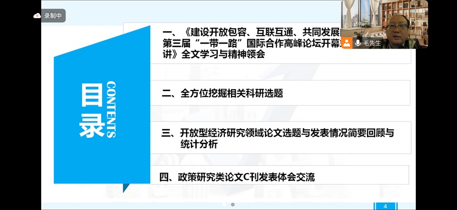 毛博士的分享题目为《习近平主席2023.10.18在第三届“一带一路”国际合作高峰论坛开幕式主旨演讲与2024年高级别项目申报相关选题挖掘》,通过对《建设开放包容、互联互通、共同发展的世界——在第三届“一带一路”国际合作高峰论坛开幕式上的主旨演讲》进行全文学习,领会其精神,并从中挖掘科研选题,把握研究方向。毛博士对文件进行深度思考,挖掘出包括开放经济、国际合作、人工智能、鲁班工坊、民间交往等在内的三十个研究方向,为公司教师的高水平论文的写作发表以及高级别项目的申报提供了灵感来源。