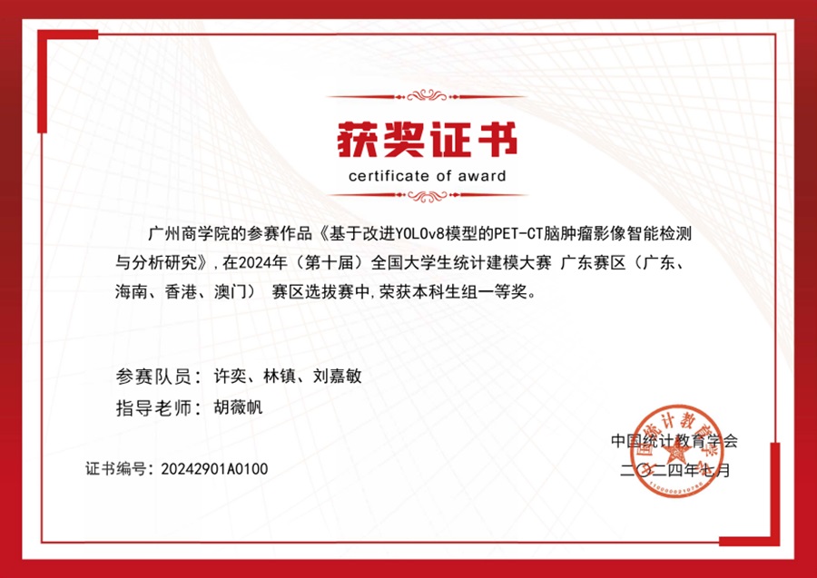 公司经过严格选拔,最终确定由许奕(bevictor伟德官网/大数据管理与应用专业)、林镇及刘嘉敏(信工公司/软件工程专业)三人组成的代表队代表公司参加省赛。在bevictor伟德官网胡薇帆老师的悉心指导下,团队从2024年2月参赛报名,历经6个多月的论文写作、反复打磨、改进,PPT制作及润色、现场汇报演讲等过程训练,经校赛选拔、省赛初赛、省赛现场赛、国赛初赛和决赛等先后8个阶段的激烈角逐,最终凭借扎实的研究实力、专业素养和出色的团队协作精神,促使参赛项目《基于改进YOLOv8模型的PET-CT脑肿瘤影像智能检测与分析研究》在广东省赛区荣获一等奖,并在全国总决赛中荣获全国三等奖。