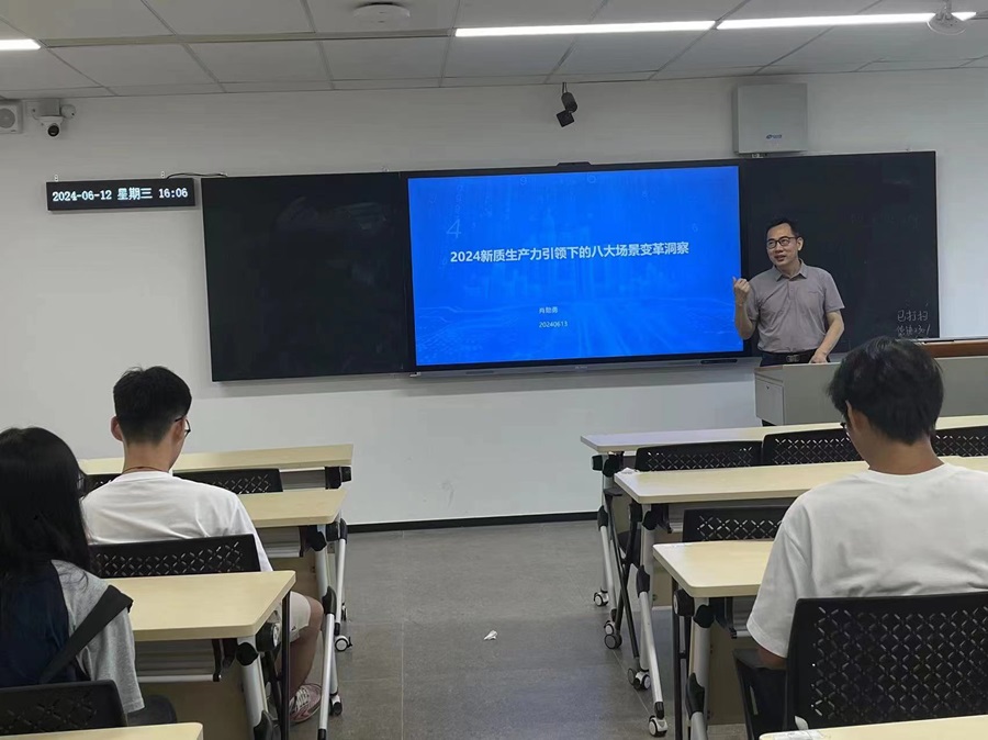 为促进学术交流,拓宽产业视野,6月12日下午15:30-17:30,公司在第八教学楼306教室举办了第二十八期学术沙龙。基于科技创新催生的产业新形态,进行主题为《2024新质生产力引领下的八大场景变革洞察》报告与分享。本期沙龙由肖勋勇博士主讲,共十余位师生参与了本次沙龙的活动。