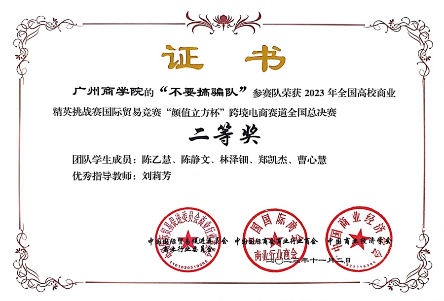 10月28日,2023年全国高校商业精英挑战赛国际贸易竞赛“颜值立方杯”跨境电商赛道全国总决赛圆满落幕。公司参赛团队“不要搞骗队”、“W.T.A.”和“意识流队”分别荣获两项全国总决赛二等奖和一项全国总决赛三等奖的优异成绩。