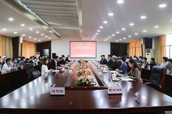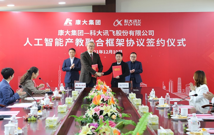 12月10日,康大集团与科大讯飞股份有限公司正式签署人工智能产教融合框架协议。康大集团执行董事长郭小聪,科大讯飞股份有限公司高教人才培养业务线副总裁胡江院、华南区市场总经理兰明博、华南有限公司智慧城市BG总经理杨增南,国家级人才称号获得者、公司董事长李晓教授,相关校领导及师生代表等嘉宾出席签约仪式。