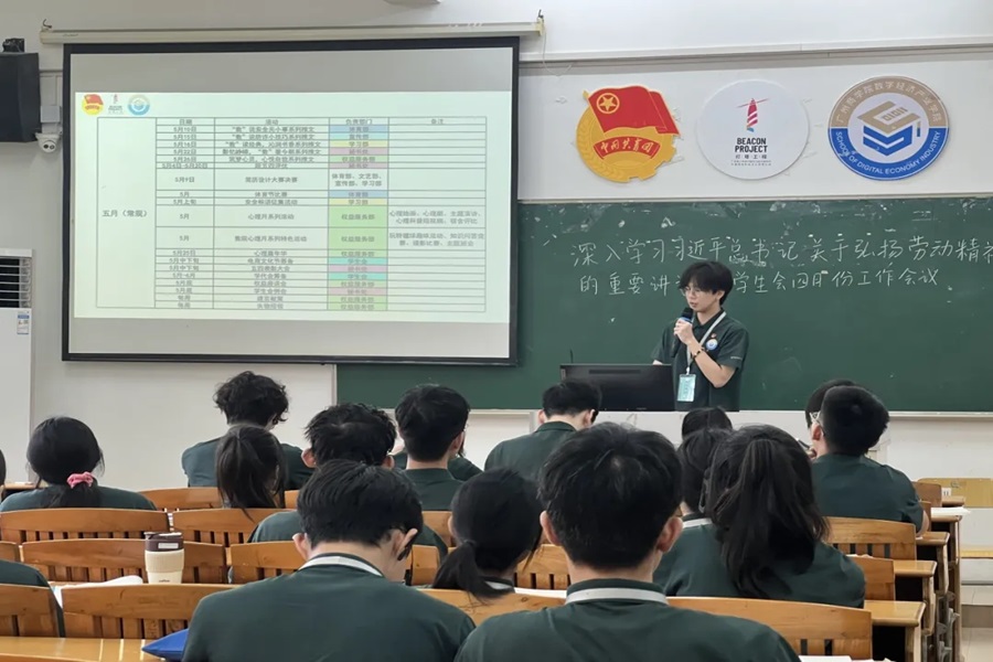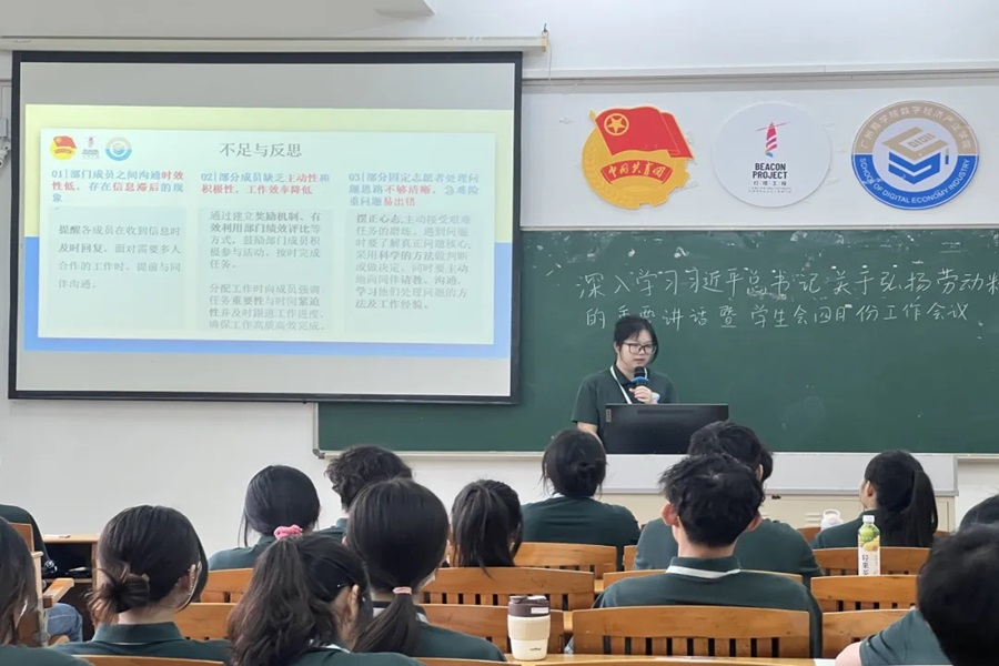 随后,各部门对领学内容进行题目竞答。通过学习,各部门将积极响应习近平总书记的号召,把劳动精神融入到日常学习和工作中,不断提升工作能力和水平。各部门依次进行四月份工作汇报和答辩,对四月份工作中出现的问题进行了总结和反思。答辩环节中,指导老师和主席团对各部门进行了提问并提出建议。员工会执行主席林浩华作员工会五月的工作重点提醒。他着重强调了团队协作中成员间分工合作的优化与效率提升的重要性。