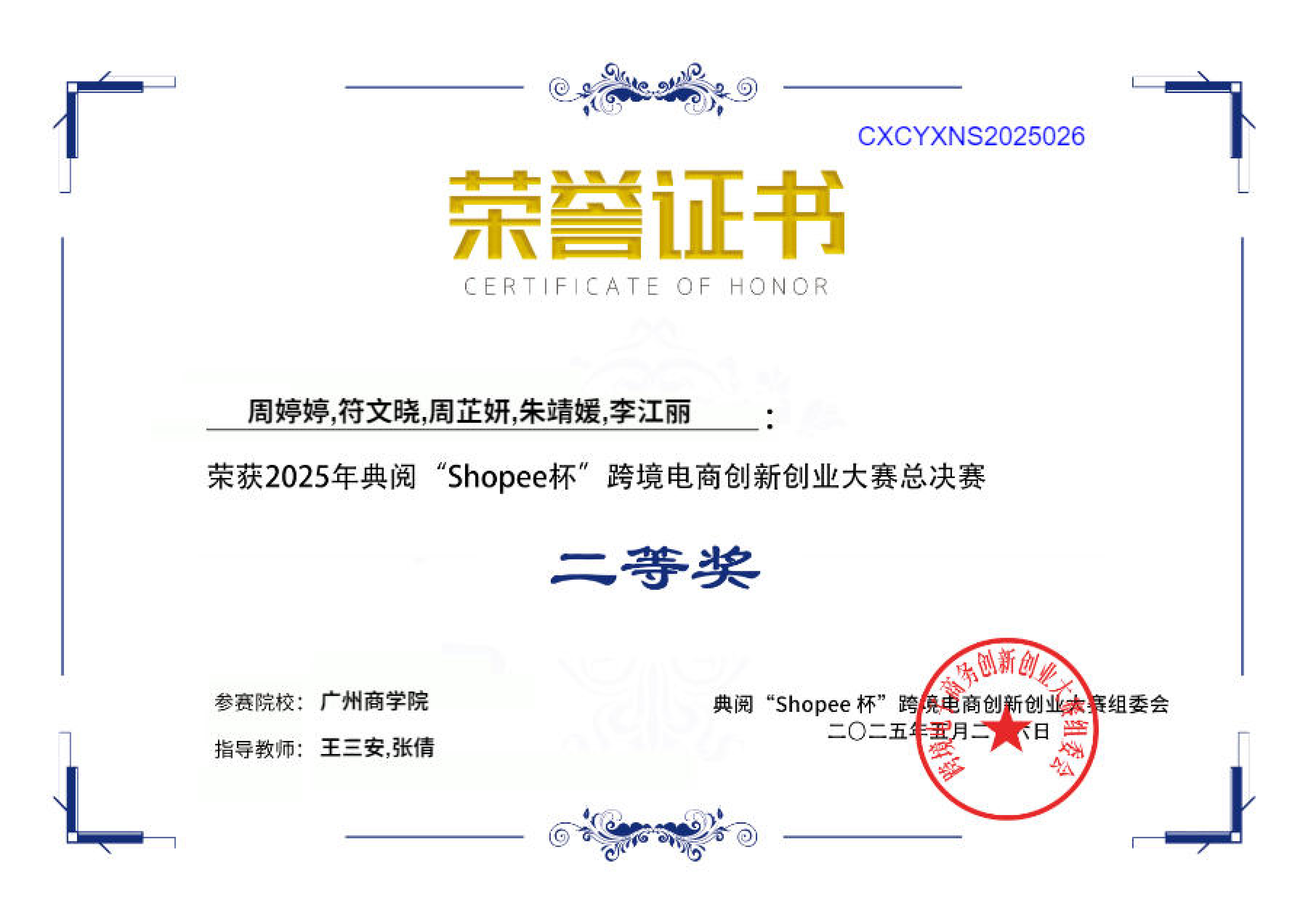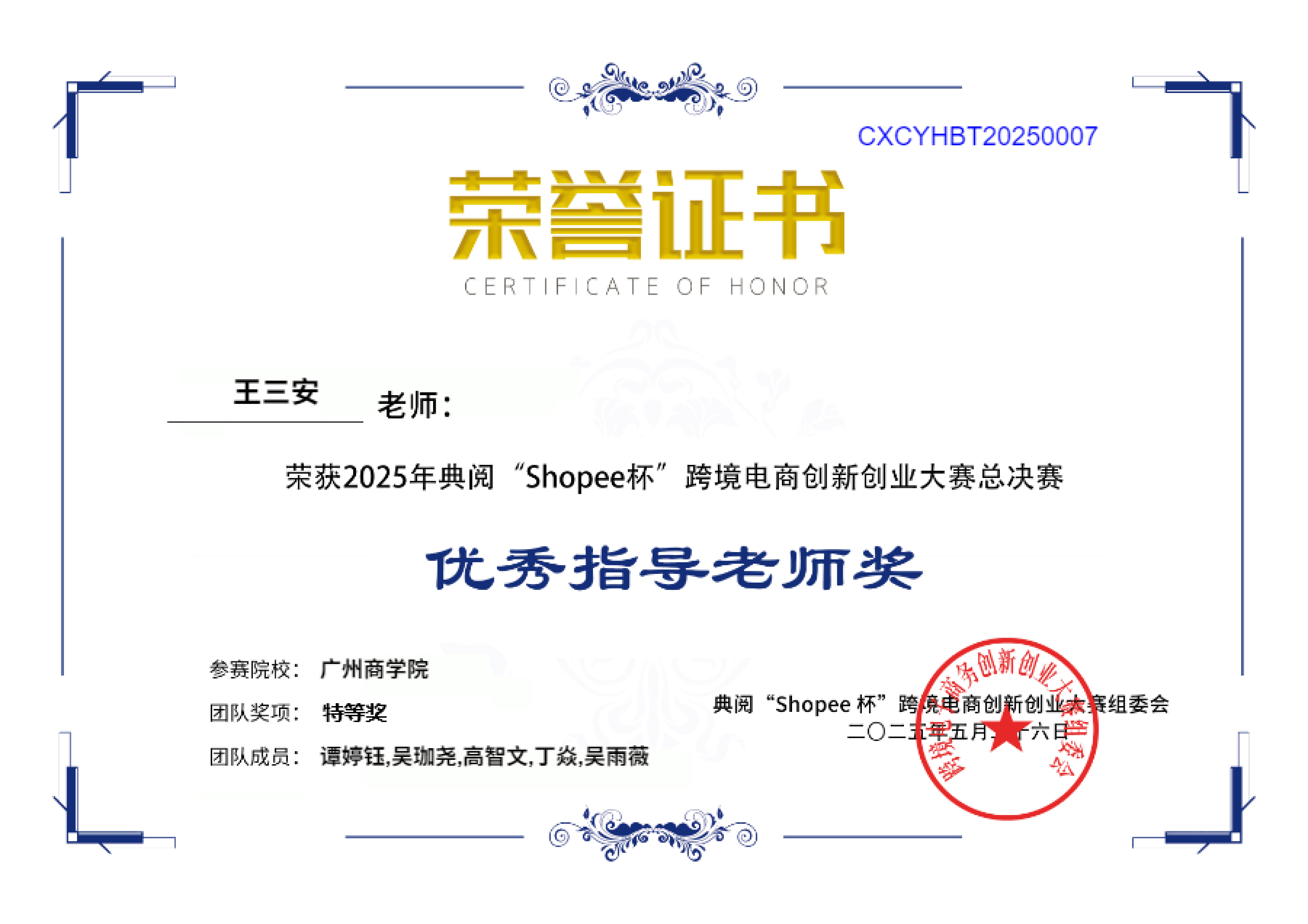 最终,由吴雨薇、丁焱、高智文、吴珈尧、谭婷钰等同学组成的广商一队勇夺特等奖,由李江丽、朱靖媛、周芷妍、符文晓、周婷婷等同学组成的广商三队荣获二等奖,由刘琳琳、唐嘉欣、曾燕玲、蔡炜妍、黄莉等同学组成的广商二队荣获三等奖。与此同时,指导老师王三安也荣获了本届赛事“优秀指导老师”的称号。此次,晋级总决赛队伍数量和获得名次均创下公司自参加2020年首届赛事以来的最佳。
