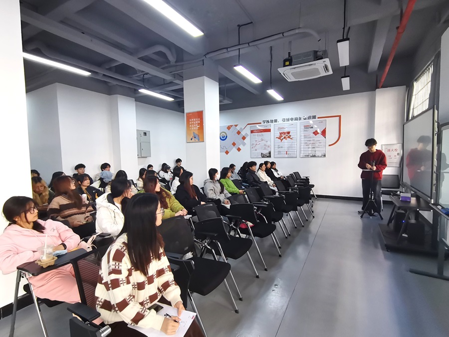 詹雨亭首先回顾了本学期同学们在直播和短视频方面所取得的显著成绩。根据马克图布方提供的数据显示,在直播方面,截止12月18日共直播37场次,总直播时长104小时,单场实现1+1工作模式,即一名主播搭配一名运营的工作模式,直播总曝光3.89万次,曝光观看率最高至35.39%;商品曝光点击最高至26.95%。在短视频方面,11月发布视频共158条,完成账号“别打扰我拆礼物”和“来一口卷心菜”短视频运营工作,其中“别打扰我拆礼物”视频总播放量达3.1万,互动数据(转赞评)高达644,作品搜索量2.8千以上;“来一口卷心菜”视频总播放量达2.89万,高于91.47%同类创作者,视频互动数据(转赞评)高达633。